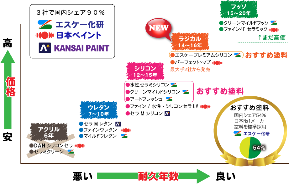 ここ10年くらいは、圧倒的な性能と価格で90%以上のお客様がシリコンを選ばれていましたが、さらに高性能なラジカル塗料が発売され2大人気となりました。